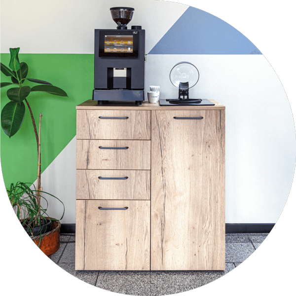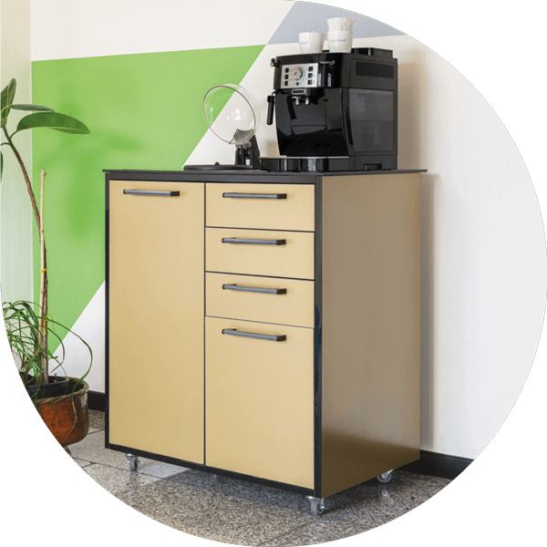 La versione coffee corner mobile offre il sistema di lavaggio inserito in un apposito mobile carrellato, facilmente spostabile, dotato di anta e 4 cassetti a guida rallentata.