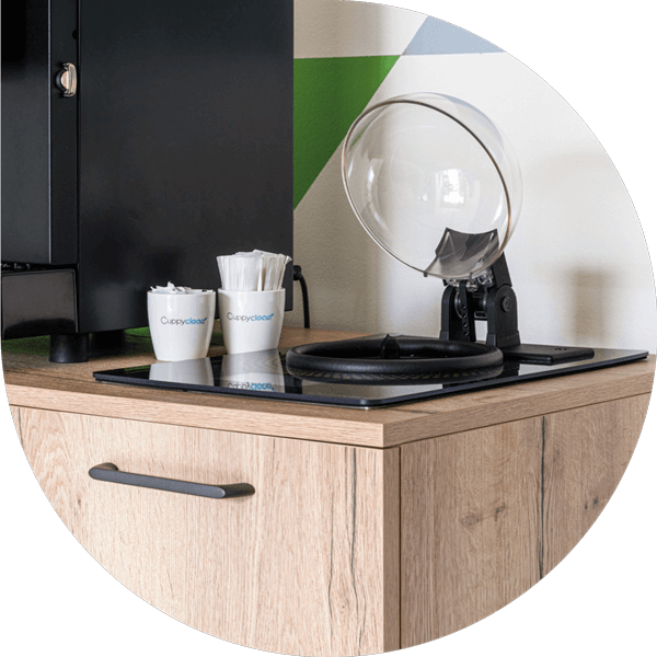 Il sistema CuppyClean è composto da un generatore di calore, camera lavaggio tazzina con cupola protettiva trasparente (a chiusura